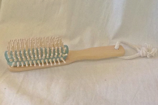 OUT OF STOCK $10! Wooden hair brush with hanging loop.