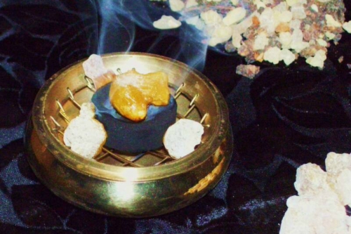 Once the charcoal is lit, it should be placed at the peak of the insulation material to allow air circulation. A pinch or two of the incense material can be added at this point. As the smoke begins to thin out, more material can be added. The charcoal will stay hot enough to burn incense for about 45 minutes to an hour.