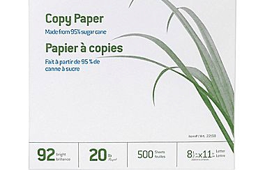 Choose Sustainable Earth 95% sugarcane copy paper made from a renewable resource that is more environmentally friendly than harvesting trees. The paper is copier and printer-friendly and is 100 percent satisfaction guaranteed.