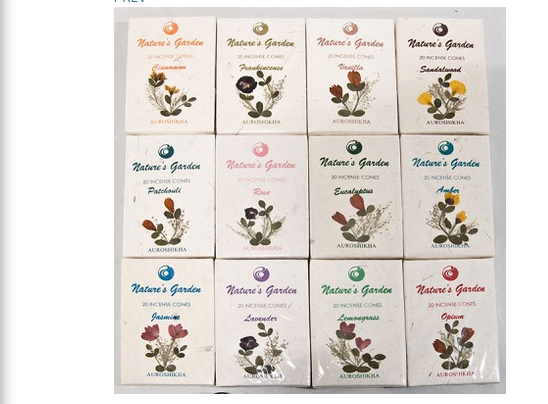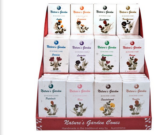 Nature's Garden is a premium incense made at the Sri Aurobindo Ashram in Pondicherry, India. The incense cones are made of a paste consisting of the powders of dried flower petals, sweet-smelling herbs and woods, spices, resins, charcoal and essential oils. All these ingredients are mixed with water to form a paste. The paste is then filled into cone moulds and left to dry.