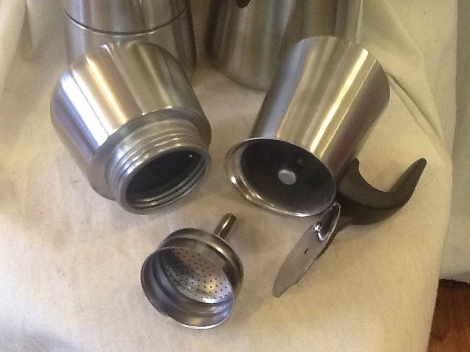 Stainless steel espresso pots are not dishwasher safe, hand wash only. Never use other contents besides coffee like teas, cacao powder, instant coffee or fine ground coffee as it will clog the filter plate.