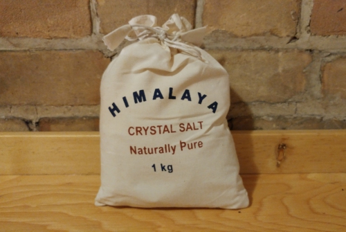 This course, pink, Himalayan salt is sold in a 1kg cotton bag.