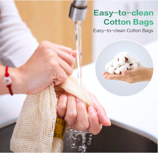 WASHABLE COTTON MESH BAG - Simply wash them in cold water (Machine washable), smooth out the wrinkles and air-dry them, then you can use them over and over again