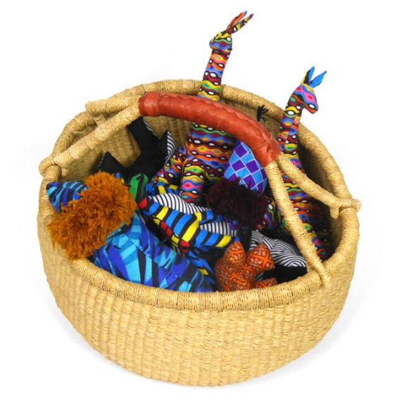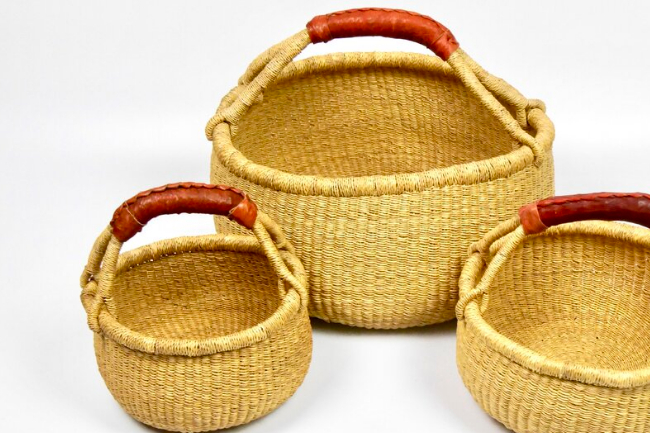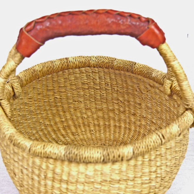 The basket is made of natural veta vera (vetiver) grass straw, handles are covered with goatskin. Avoid long-time use in humid conditions. Should the basket lose its shape, hydrate it lightly, and restore its initial form. Allow it to dry in a well-ventilated room. Colours may fade in contact with direct sunlight. Caution: this product may splinter.