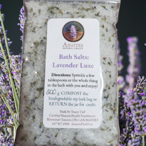 Ingredients: Mediterranean sea salt, Epsom salt magnesium sulfate, lavender essential oil Lavandula angustifolia, lavender flowers.