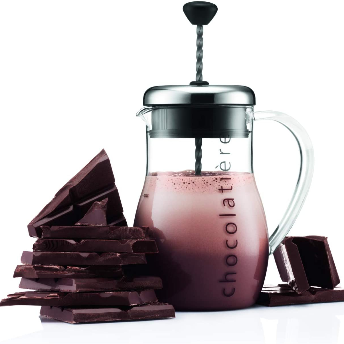 The jug is made from heat-resistant borosilicate glass that won’t alter or impair the taste of your delicious chocolate and is microwave safe. Designed for use with real chocolate pieces, syrup or powder, the plunger powers a propeller that mixes the chocolate and milk, while thickening and frothing it.