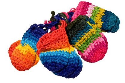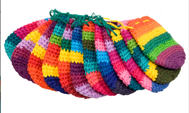 These assorted colourful crocheted bags are handmade in Guatemala. Each bag has a rounded bottom and can be cinched at the top with a drawstring. They have a long cord that can be worn around the neck, perfect for holding your favourite stones.