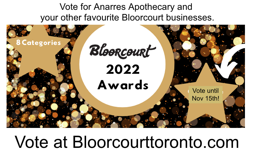 Anarres Apothecary needs a boost more than ever, so I am hoping that you'll vote for Anarres Natural Health in one or more categories until Nov 15th at http://www.bloorcourttoronto.com/